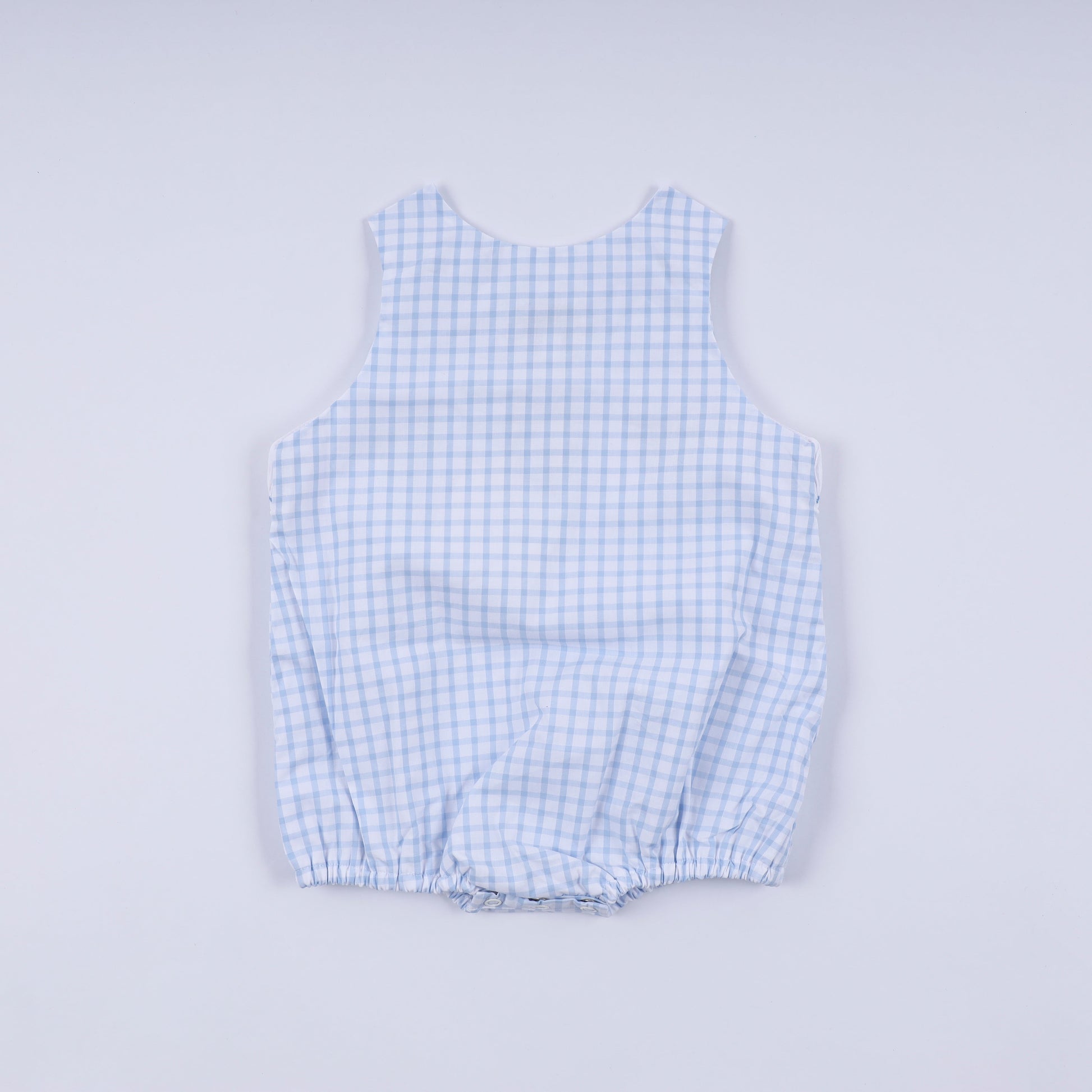 Adorable bubble romper featuring a charming character design set against classic gingham checks. Hand-smocked detailing adds texture and vintage-inspired appeal, while the relaxed bubble silhouette keeps little ones comfortable and stylish. Perfect for playdates, family outings, or everyday wear. The soft blue palette complements any wardrobe, making this a versatile piece that parents and kids will love.