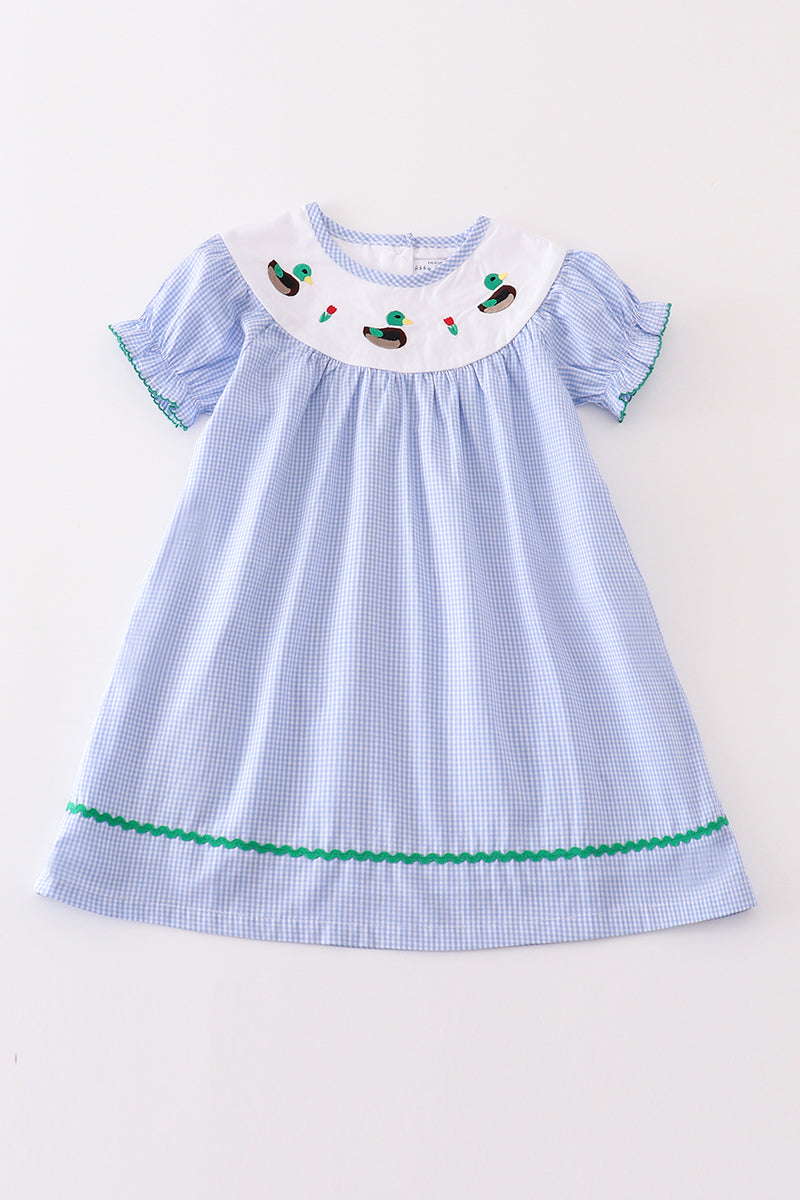 Quack up your little girl's wardrobe with this blue duck embroidered dress! A playful twist on a classic design, she'll be the cutest little duckling around. Perfect for any occasion, this dress is quack-tastic!