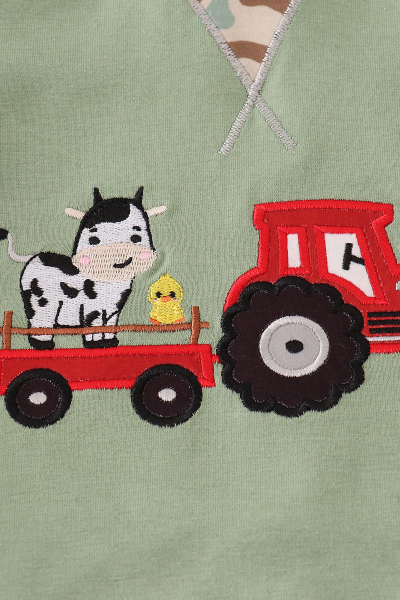 Get ready for fun-filled days with this Green Camouflage Cow Tractor Applique Pants Set! Featuring playful cow and tractor appliques on a cool camouflage background, this set brings a touch of farmyard adventure to your little one’s wardrobe. Comfortable and cute, it’s perfect for active play and imaginative outings.