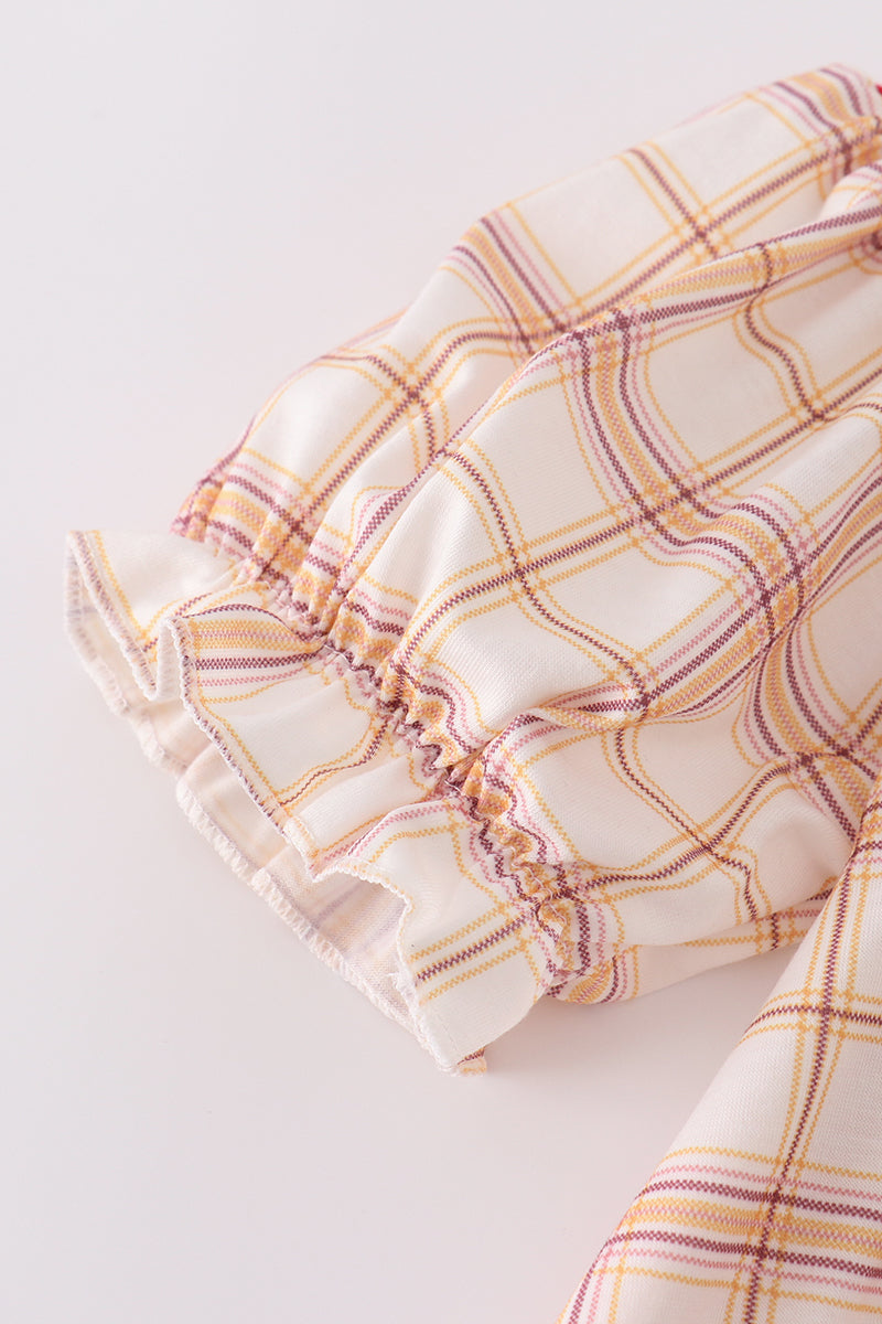 Get your country chic on with our Khaki Farm Dress! Embroidered with cute farm animals, smocked for the perfect fit, and adorned with a classic plaid pattern, this dress is both stylish and playful. Perfect for any occasion, from a day at the farmer's market to a picnic in the park.