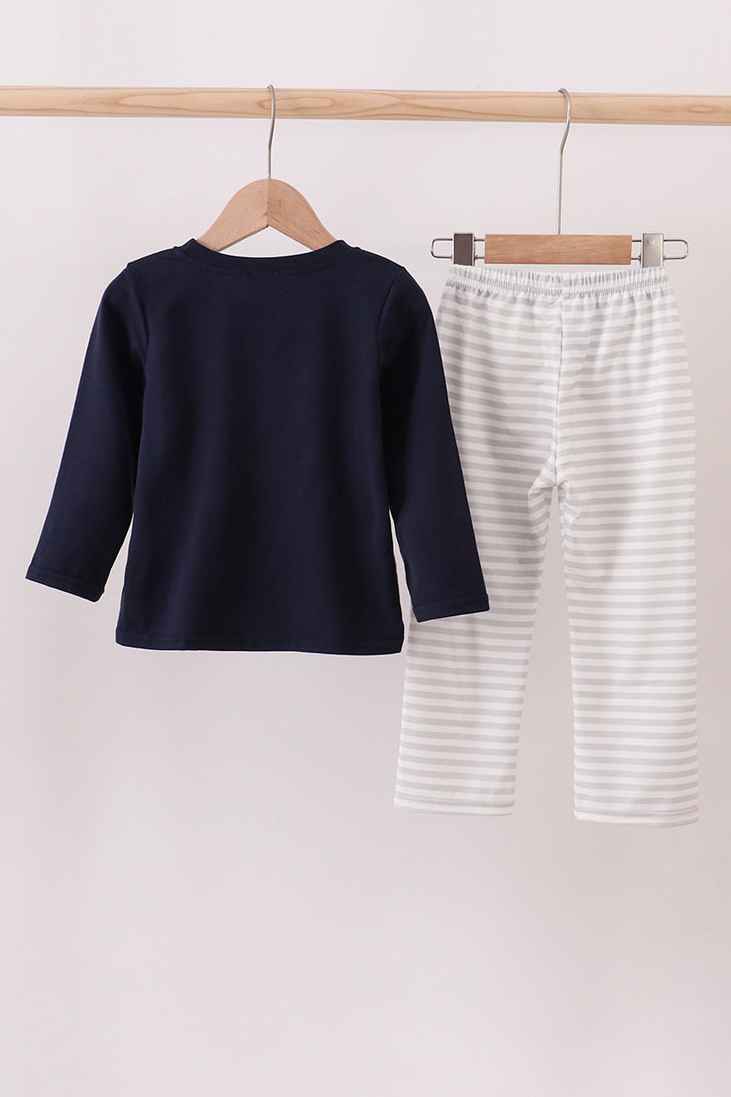 Celebrate the holiday spirit in cozy style with this Navy Christmas Santa Claus Embroidery Stripe Pants Set. Featuring festive Santa embroidery and cheerful stripes, these pants bring playful charm to your loungewear. Perfect for relaxing at home or spreading holiday cheer, the soft fabric ensures comfort while the unique design adds a merry touch to your seasonal wardrobe.
