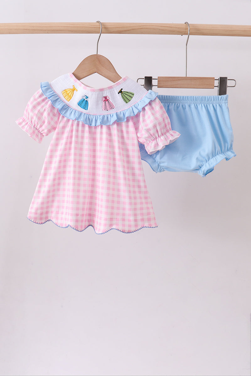 Introduce your little one to timeless elegance with this charming pink princess smocked gingham ruffle bloomer set. Featuring delicate smocking details and playful ruffles, this two-piece ensemble combines classic gingham patterns with princess-inspired design. The soft, breathable fabric ensures comfort for all-day wear, while the coordinated bloomer bottoms provide modest coverage. Perfect for special occasions, photo sessions, or everyday dress-up play. A sweet addition to any child's wardrobe that celebrates vintage-inspired style with modern comfort.