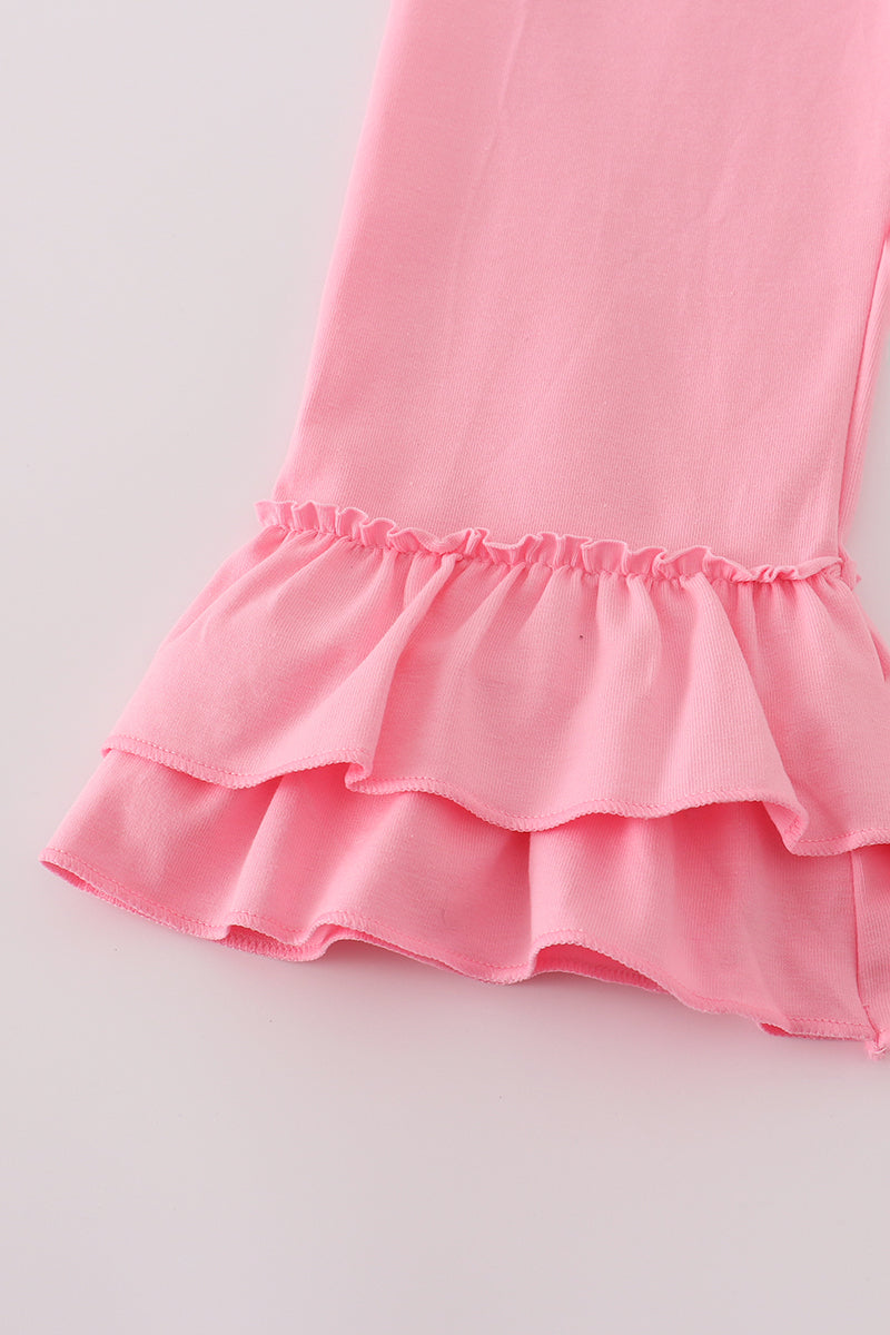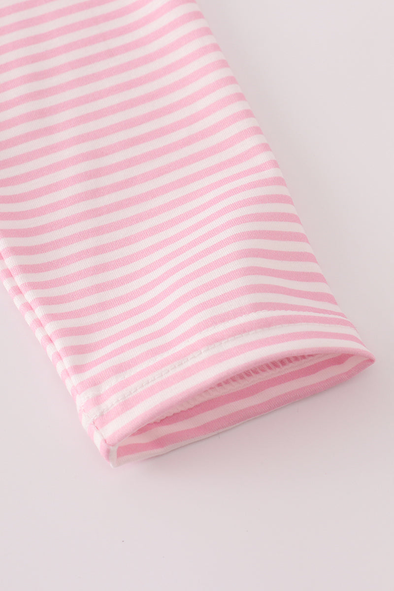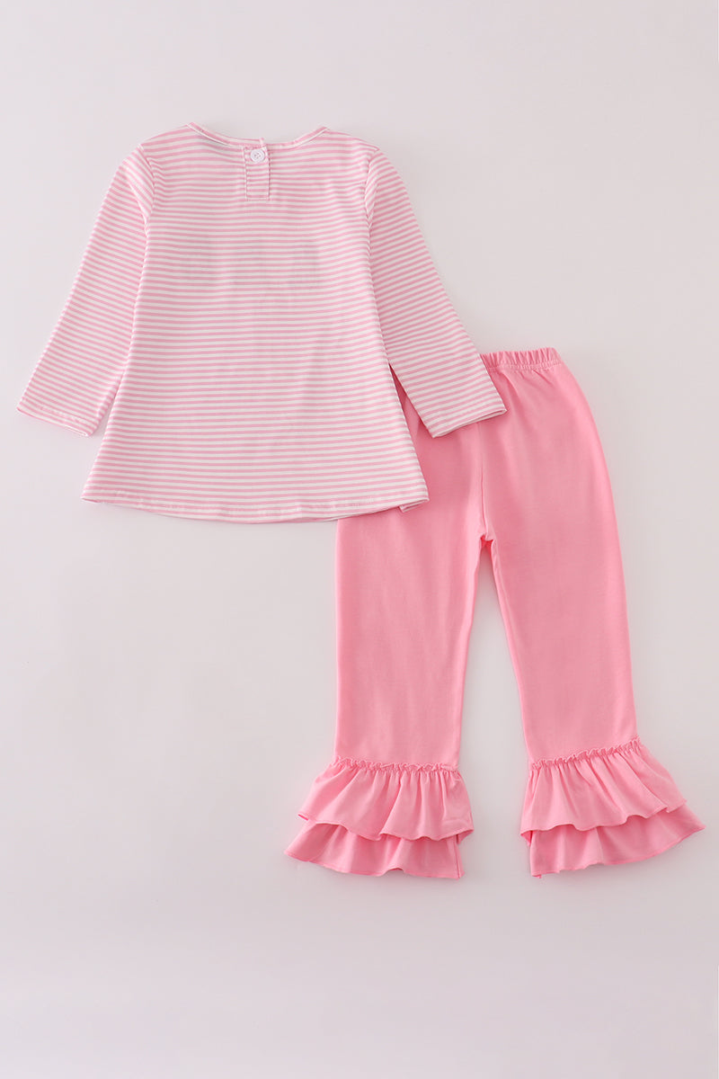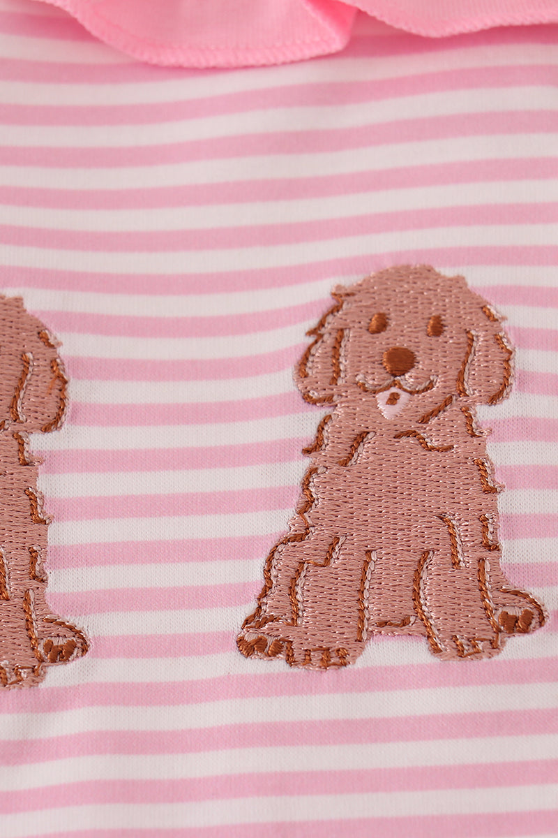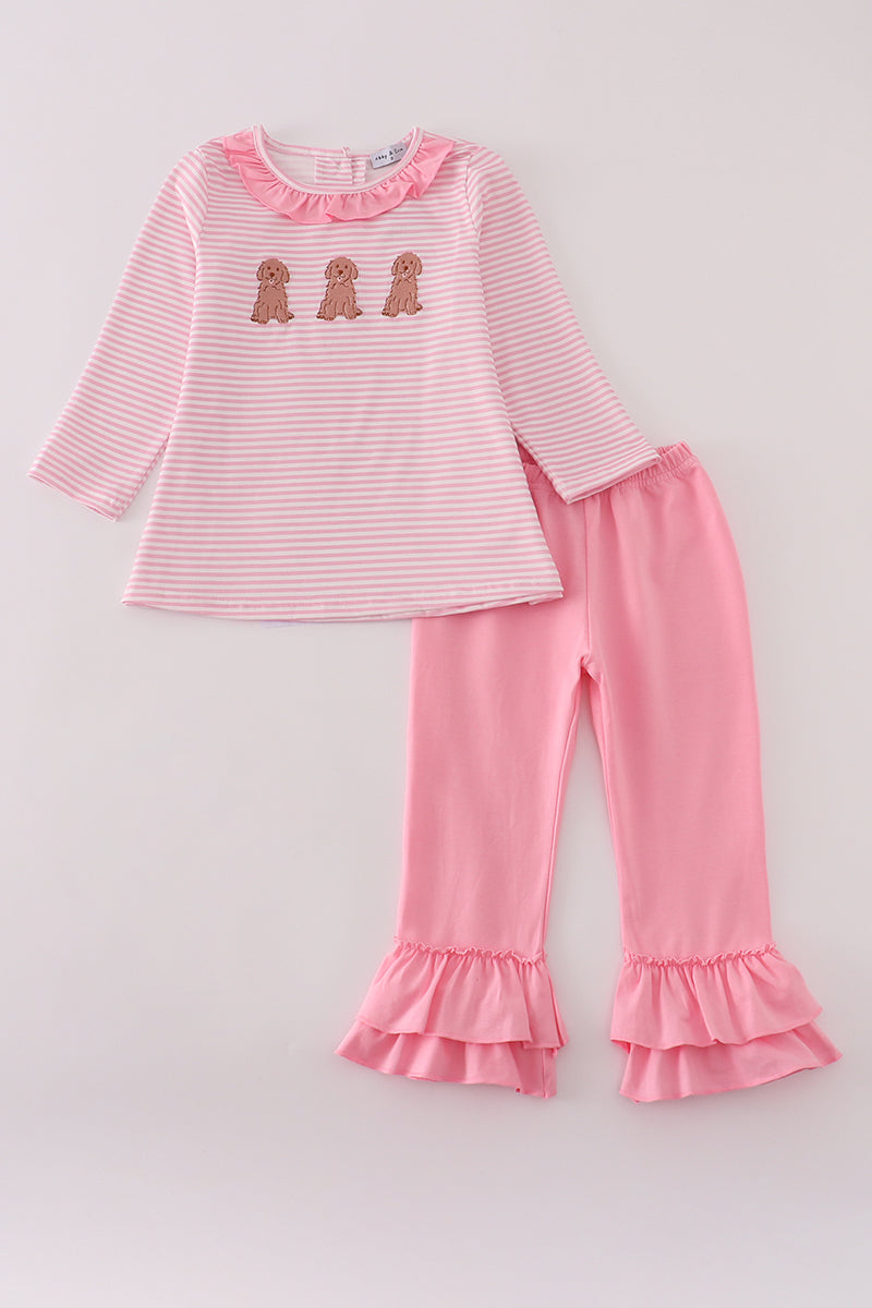 Dress your little one in adorable style with this Pink Stripe Puppy Embroidery Ruffle Pants Set. Featuring charming puppy embroidery and playful ruffle details, this set combines comfort with cuteness. The soft striped fabric ensures all-day coziness, making it perfect for playdates or cozy days at home. Add a touch of fun to your child's wardrobe with this delightful outfit.